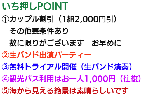 | 古くから名湯と言われ、お風呂自慢のホテル 海底風呂でお泳ぐお魚を見ながらリフレッシュ! さくら材の広いダンスホールは踊りやすいと評判です パーティーは弊社の貸切! 旬の素材を使用した和食膳をご賞味ください |
