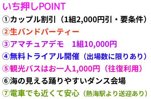 | 毎回大人気の優雅なダンスパーティー 熱海の夜景をバックに皆様楽しく踊りましょう! 食事・お部屋・源泉大浴場や館内施設も充実 生バンド出演 朝・夕バイキングは品数豊富で大人気! |