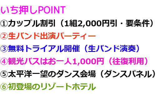 初登場!太平洋をバックに広い会場で思い切り優雅にダンスパーティー 生バンド演奏で皆様楽しく踊りましょう! 人気のリゾートホテル 食事・お部屋・源泉大浴場や館内施設も充実(朝のダンスはありません) |
