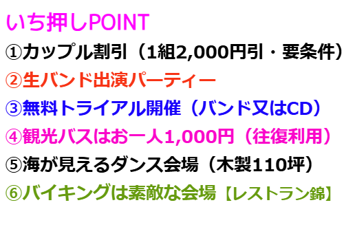 | 生バンド演奏でダンスや無料トライアルもお楽しみください |