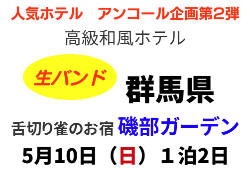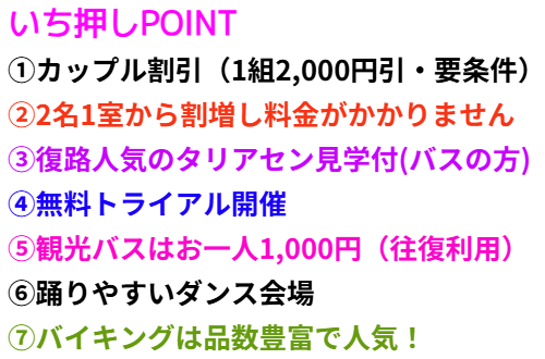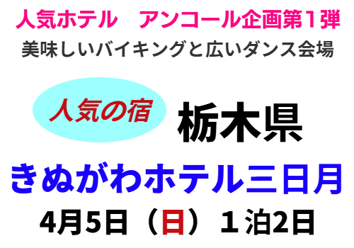| 踊りやすい会場で思い切り優雅にダンスパーティー 皆様楽しく踊りましょう! 人気のホテル 食事・お部屋・源泉大浴場や館内施設も充実 人気のタリアセン観光も付いております(バス乗車の方) |