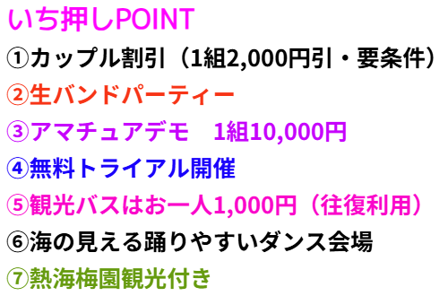 | スタンダード&ラテン、ぜひご出場ください。お客様同士は何種目でも無料、男女リボンとは1曲600円とリーズナブル |