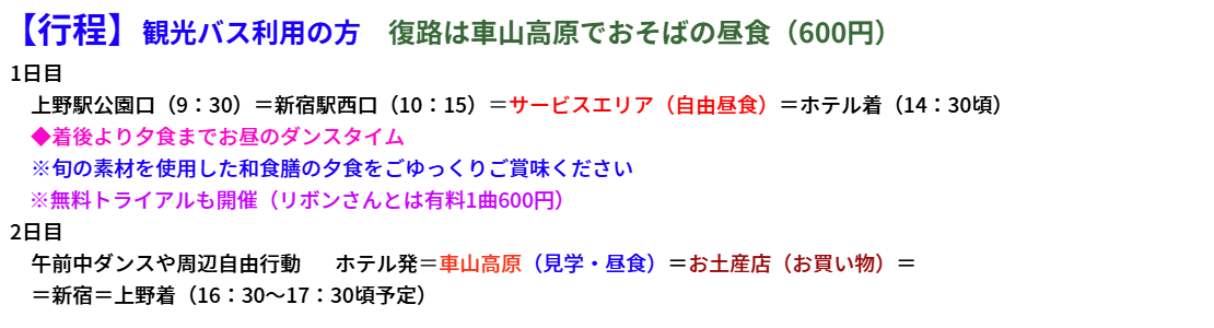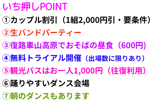 | 踊りやすい会場で思い切り優雅にダンスパーティー 本格的ダンスホールで皆様楽しく踊りましょう! 人気のホテル 食事・お部屋・ミネラル豊富天然温泉 2日目のおそばの昼食がなんと1,200円が600円で提供! |