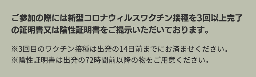 以上、上記2点を旅行ご参加当日、必ずご持参ください。ご提示いただけない場合にはご旅行にご参加できませんので